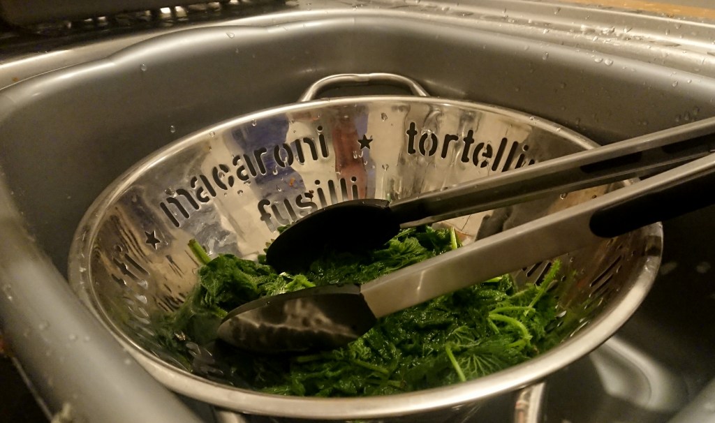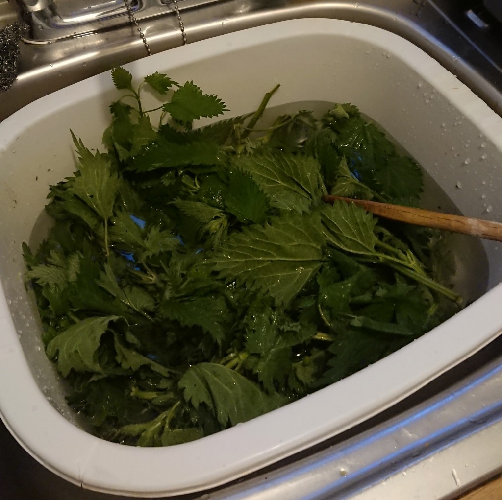 Once you’ve got your nettles back home and you want to make something, first plan is probably to empty them in to the sink and give them a good rinse under cold water – not touching them obviously as they’re still highly stingable!  Rinsing is necessary to remove anything that may have sneaked into your kitchen from the woods.