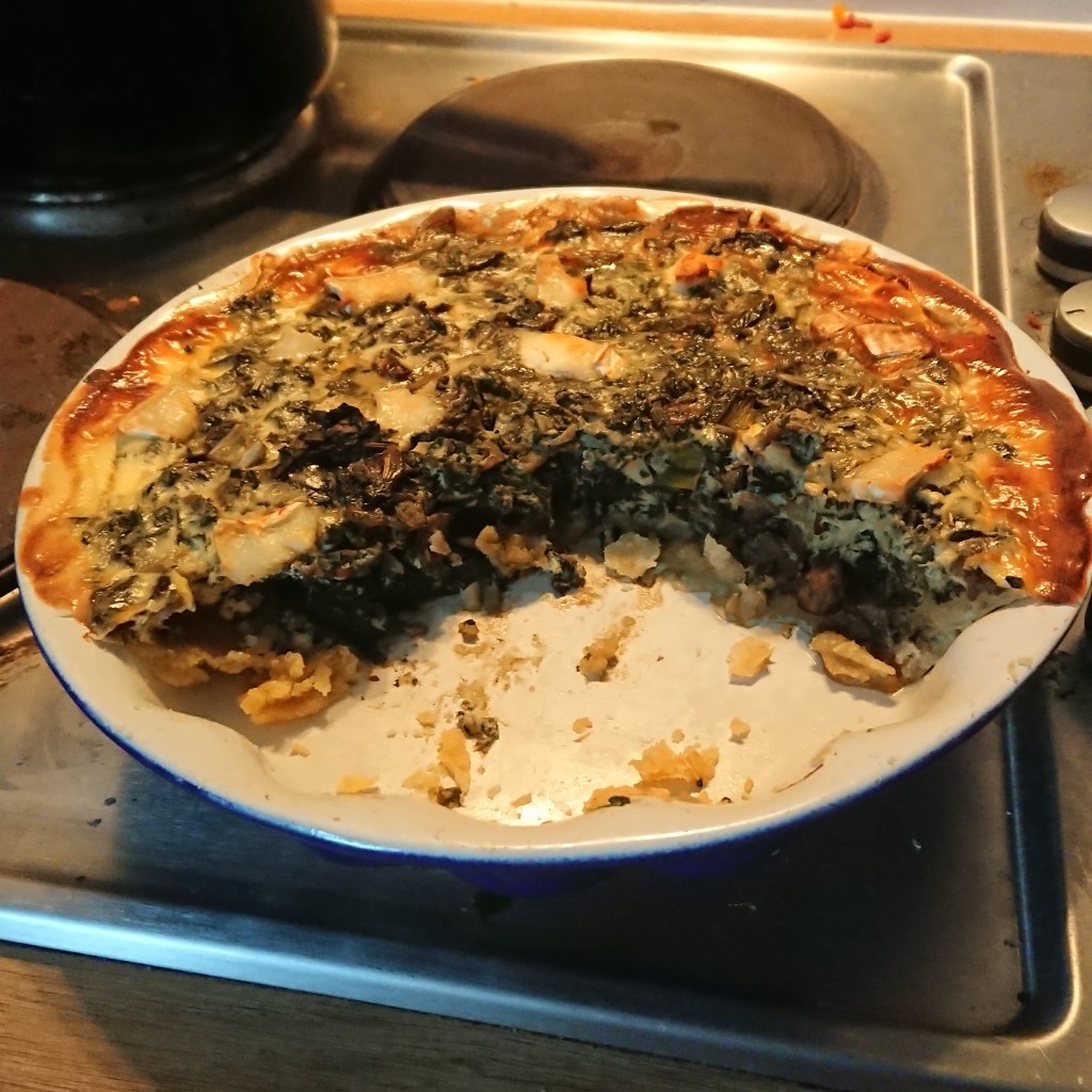 Right, now all your elements can combine together, mix the fried content of the pan with the liquid before pouring all of it in to the pastry base.  Bake at 180 degrees for about half an hour or until browned.